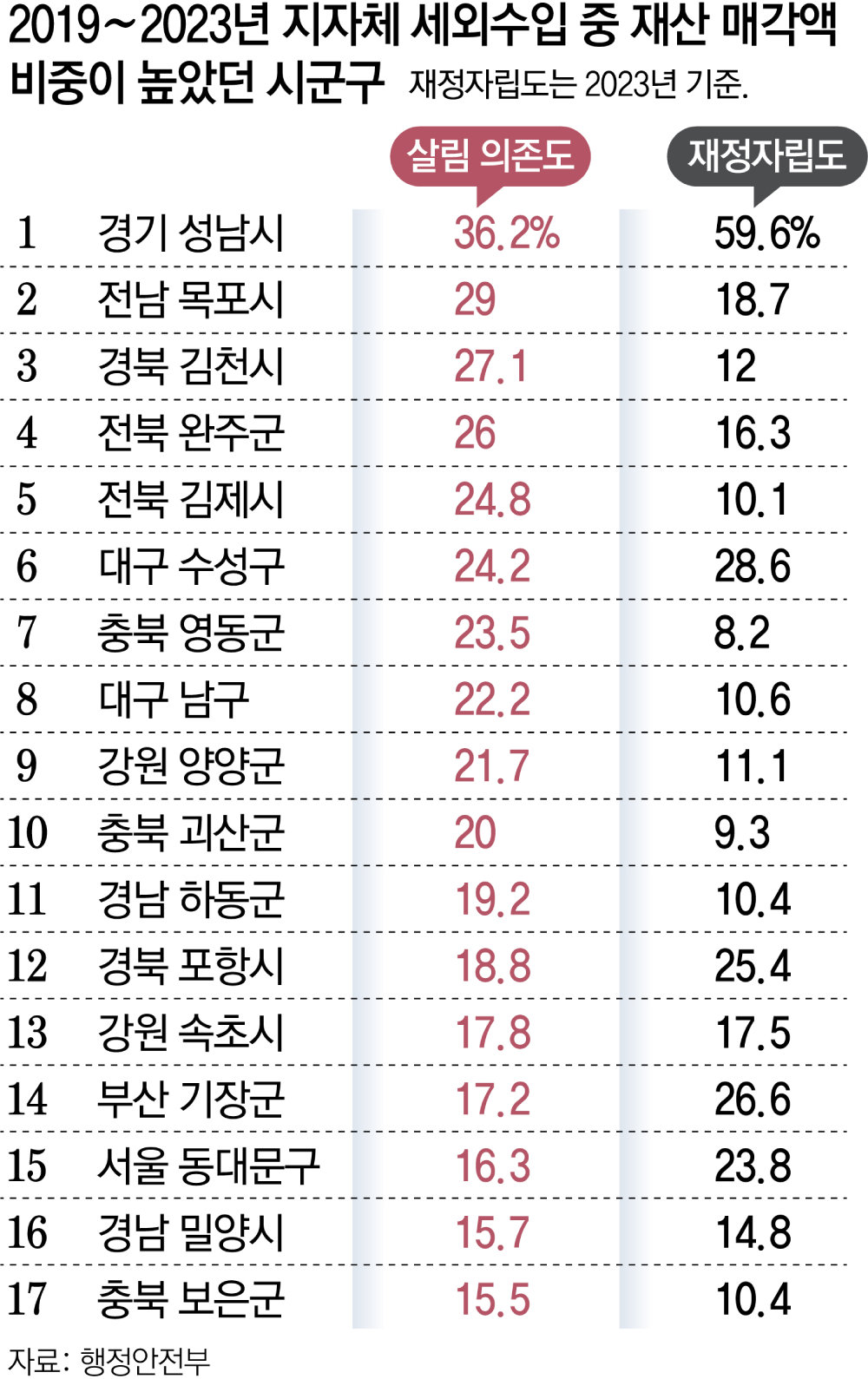 재정이 열악한 지방자치단체일수록 땅과 건물 등 재산을 팔아 살림을 메우는 비중이 큰 것으로 확인됐다. 동아일보가 2019∼2023년 지자체 세외수입 중 재산 매각액 비중이 전국 평균(5%)을 웃돈 시군구 72곳을 분석한 결과, 64곳의 재정자립도가 30%에도 못 미쳤다. 전국 평균 재정자립도는 45%다.