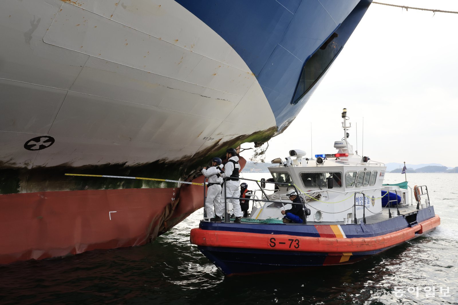 목포 제누비아 사고 현장조사 20일 전남 목포 삼학여객선부두에서 신안 족도에 좌초한 여객선 퀸제누비아 2호 사고관련 목포해경과 국과수 과학수사요원들이 경비정을 타고 해상에서 충돌부위 등 사고 조사를 하고 있다. 목포=박영철 기자 skyblue@donga.com