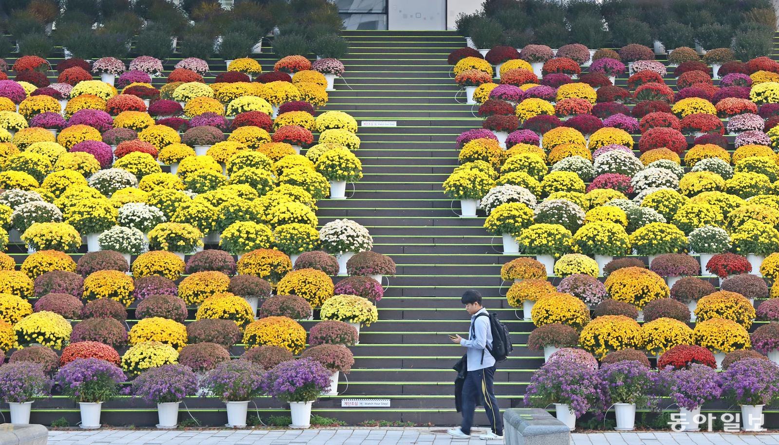 25일 대전 유성구 KAIST 캠퍼스에서 한 학생이 교정에 핀 형형색색 국화꽃 앞을 지나며 늦가을 정취를 느끼고 있다.