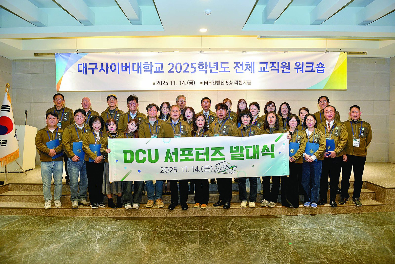 대구사이버대는 지난 14일 대구 MH컨벤션에서 ‘2025학년도 전체 교직원 워크숍 및 DCU 서포터즈 발대식’을 개최하고 대학 중·단기 발전계획(2024∼2027년) 연계 특성화 강화, 장애인 특별전형 확대, 지역 기반 학습모델 구축, 대구대와의 공동 홍보 전략, 재학생 추천 홍보 활성화 등 2026학년도 입시 전략을 공유했다. 행사에는 총장단 및 주요 보직자를 포함한 100여 명의 교직원이 참석했으며 올해 구성된 34명의 DCU 서포터즈는 박상욱 총학생회장을 단장으로 김종윤 총동창회장을 홍보 앰배서더로 임명해 대학 홍보와 브랜드 가치 제고 활동을 본격화한다. 이근용 총장은 서포터즈가 재학생의 시각에서 대학 강점을 확산하고 소통 가교 역할을 수행해 줄 것을 당부했으며 서포터즈는 향후 입시설명회 참석, 홍보 콘텐츠 제작, 봉사활동, 협약기관 홍보 등 공식 홍보대사로서 다양한 활동을 전개할 예정이다.