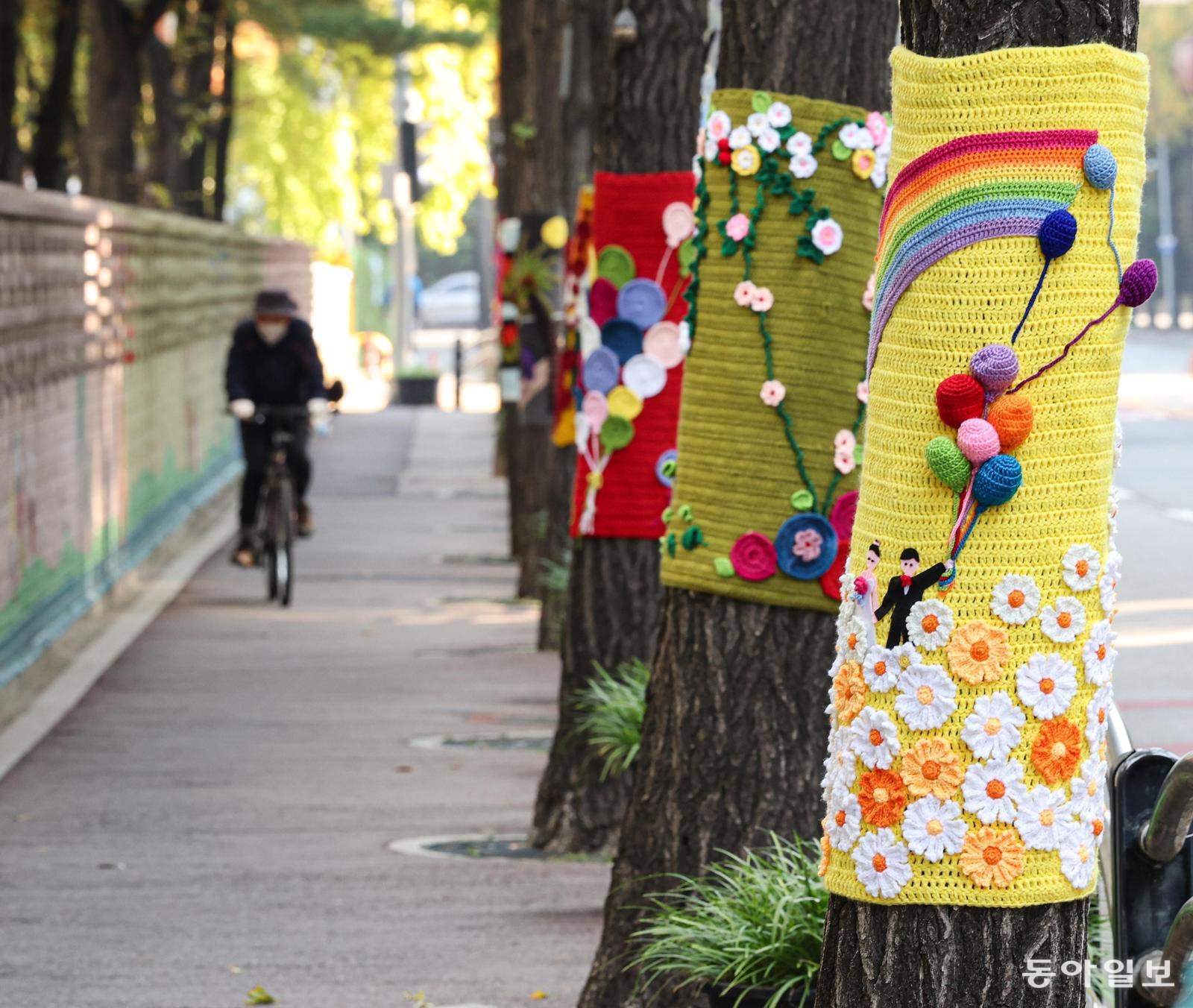 26일 경기 광명시 하안동 ‘하담길 예술의 거리’의 가로수들이 형형색색의 겨울옷을 입었다. 나무 줄기에 씌워진 뜨개옷은 하안4동 주민자치회와 자원봉사자들이 4월 봄부터 정기적으로 모여 손수 만든 작품이다.