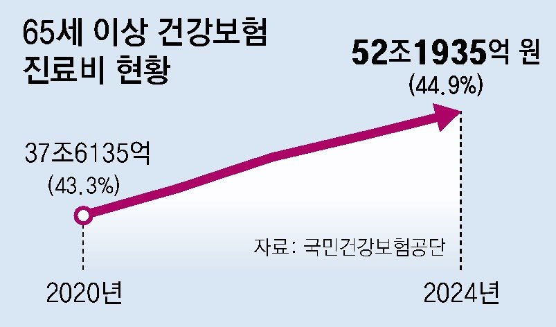 지난해 65세 이상 건강보험 진료비가 처음으로 50조 원을 넘어서며 전체 건보 진료비 중 절반가량을 차지한 것으로 나타났다. 고령화가 가속화되면서 만성질환이나 중증질환을 앓는 환자가 늘어난 영향으로 보인다.