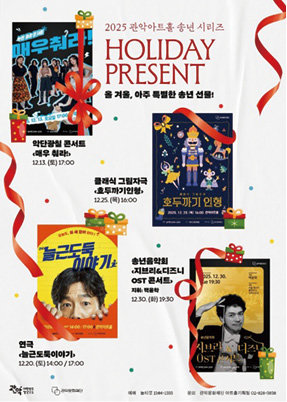 재단은 올해 송년시리즈를 ‘특별한 연말 선물세트’를 주제로, 다양한 세대가 부담 없이 즐길 수 있는 공연으로 채웠다. △악단광칠 콘서트 ‘매우 춰라!’(13일(토) 오후 5시, 전석 2만 원) △연극 ‘늘근도둑이야기’(20일(토) 오후 2시/5시, 전석 2만 원) △클래식 그림자극 ‘호두까기인형’(25일(목) 오후 4시, 전석 1만5000원) △송년음악회 ‘지브리&디즈니 OST 콘서트’(30일(화) 오후 7시 반, R석 5만 원·S석 3만 원) 등이다.