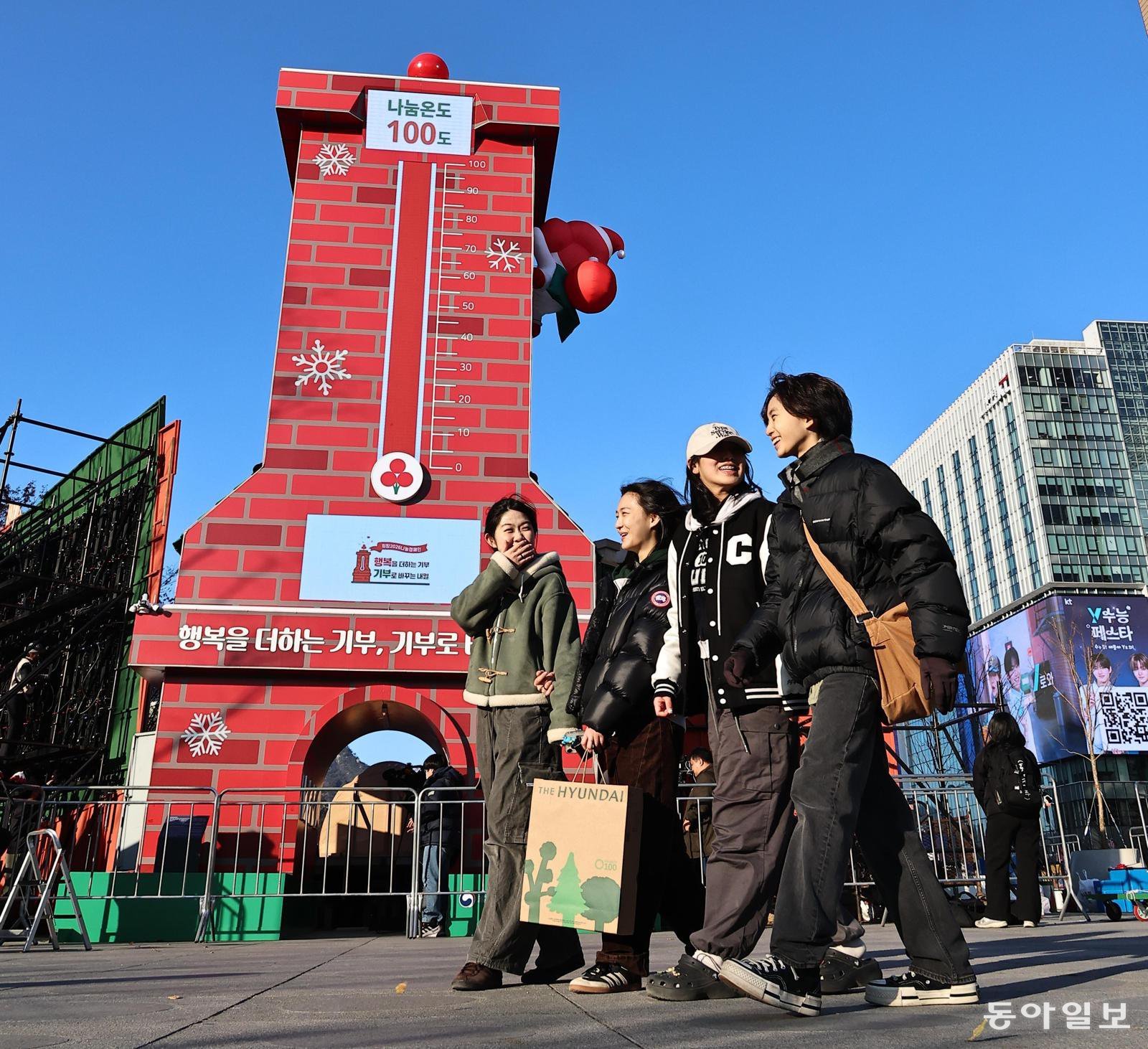 1일 서울 종로구 광화문광장에 설치된 ‘사랑의 온도탑’ 앞을 시민들이 지나가고 있다. 사랑의열매 사회복지공동모금회는 이날부터 2026년 1월 31일까지 62일간 ‘희망2026나눔캠페인’을 열고 나눔 목표액(4500억 원)의 1%를 채울 때마다 온도탑에 1도씩 표시할 예정이다. 사진 속 ‘100도’는 출범식 퍼포먼스에 따라 표기됐고, 다시 28.9도로 변경됐다.