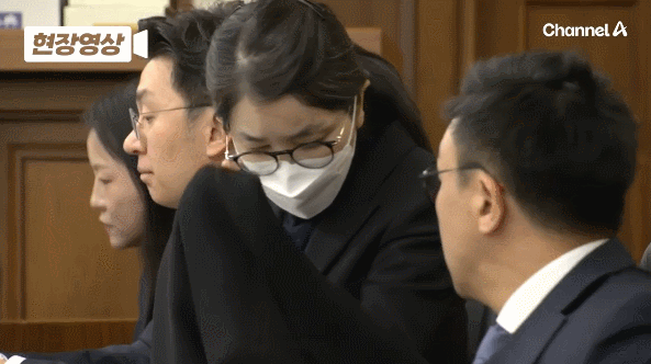 촬영된 영상에서 검은색 정장을 입은 김 여사는 보건용 마스크를 거꾸로 착용한 채로 부축을 받으며 착석했다. 피고인석에 앉은 뒤에는 겉옷을 벗고 변호사와 대화했다.