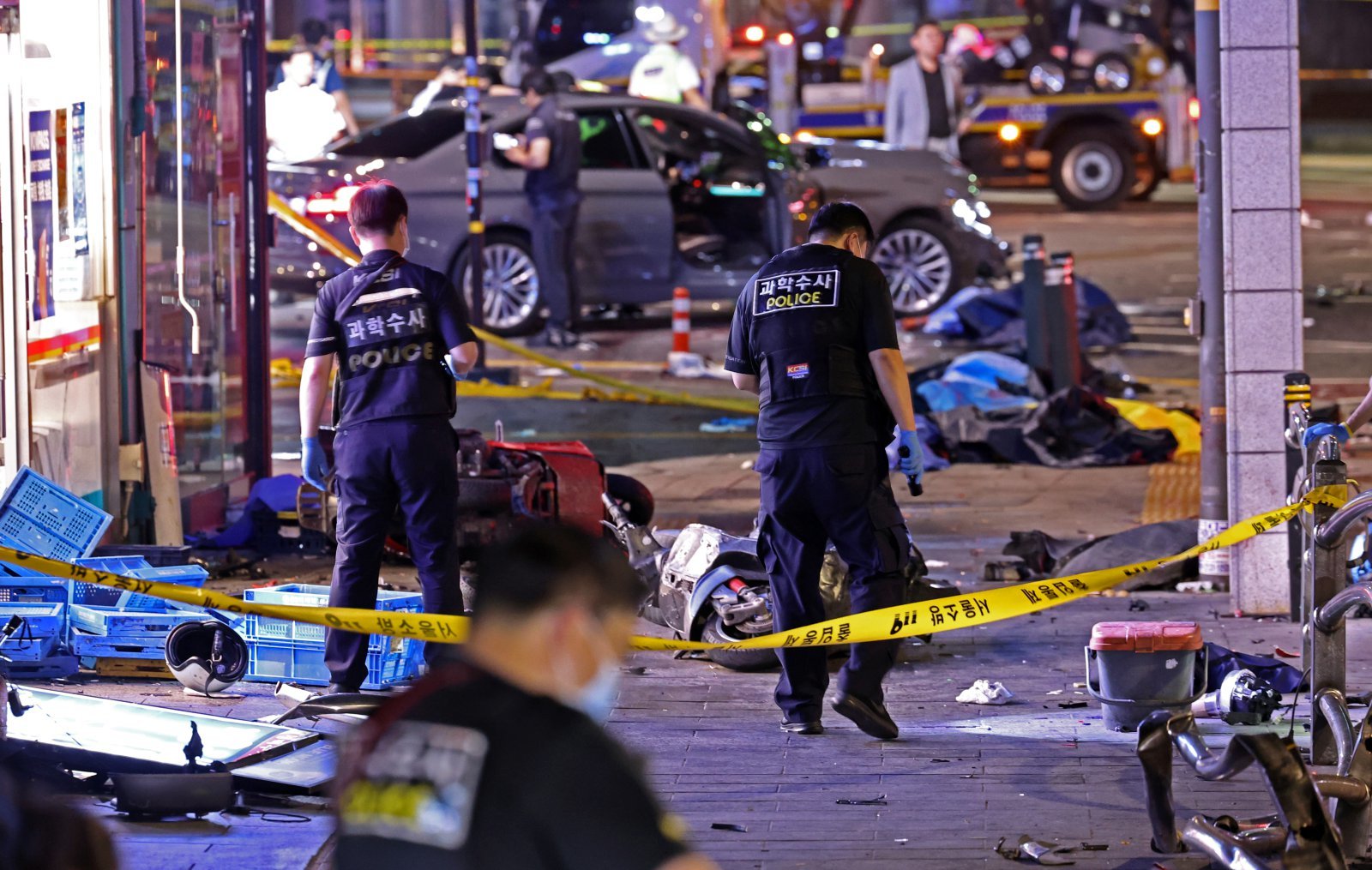 2일 오전 서울 중구 서울시청 인근 교차로 대형 교통사고 현장에서 과학수사대가 현장조사를 하고 있다. 지난 1일 오후 9시 27분쯤 서울시청 인근 교차로에서 차량이 인도로 돌진해 9명이 숨지는 대형 교통사고가 발생했다. 경찰과 소방당국에 따르면 이 오후 9시27분께 서울 지하철 2호선 시청역 인근 교차로에서 제네시스 차량이 역주행해 BMW, 소나타 등 차량을 차례로 친 후 횡단보도에 있던 보행자들을 덮치는 사고가 발생했다. 2024.07.02. [서울=뉴시스]