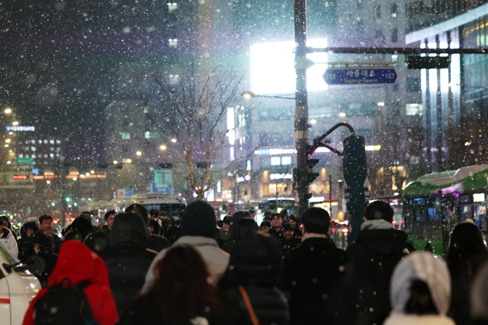 첫눈이 내린 4일 오후 서울 광화문 네거리에서 퇴근길 시민들이 발걸음을 재촉하고 있다. 2025.12.4/뉴스1