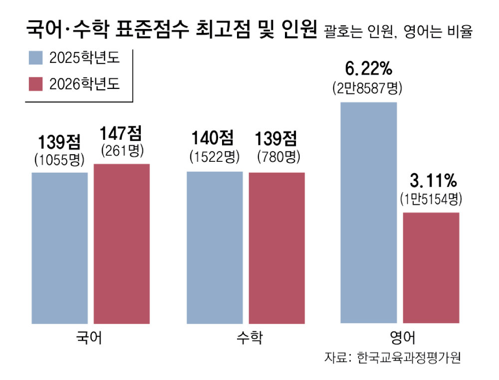 한국교육과정평가원이 4일 발표한 2026학년도 대학수학능력시험(수능) 채점 결과에 따르면 올해 국어 영역 만점자(표준점수 최고점을 받은 수험생)는 261명으로 전년(1055명)보다 크게 줄었다. 수학 영역 만점자도 780명으로 지난해 1522명보다 감소했다. 영어 1등급 비율은 3.11%로 역대 최하를 기록해 정시모집에서 국어와 영어가 당락을 가를 최대 변수가 될 전망이다.