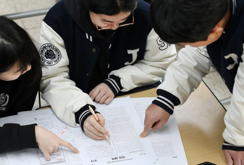 2026학년도 대학수학능력시험(수능) 다음 날인 지난달 14일 대구 수성구 정화여고에서 고3 수험생들이 수능 가채점을 하고 있다. 대구=뉴스1