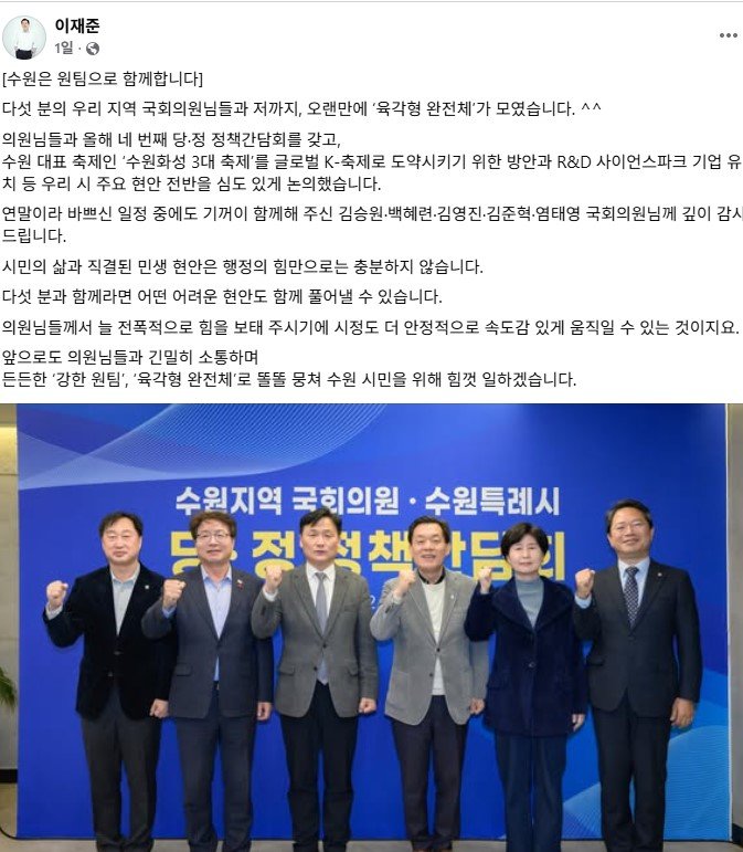 이재준 경기 수원시장이 5일 지역 국회의원들과 정책간담회를 가진 뒤 ‘수원은 원팀으로 함께 합니다’라는 제목의 글을 자신의 페이스북에 올렸다.