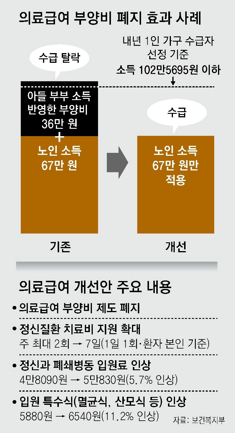 정부는 내년 1월부터 의료급여 부양비 제도를 도입 26년 만에 폐지하기로 했다. 최근 사회 현실을 반영한 조치다. 의료급여 부양비는 자녀 등 의무 부양자 소득 일부가 수급권자에게 지원된다고 보고 소득 산정액에 반영하는 제도다.