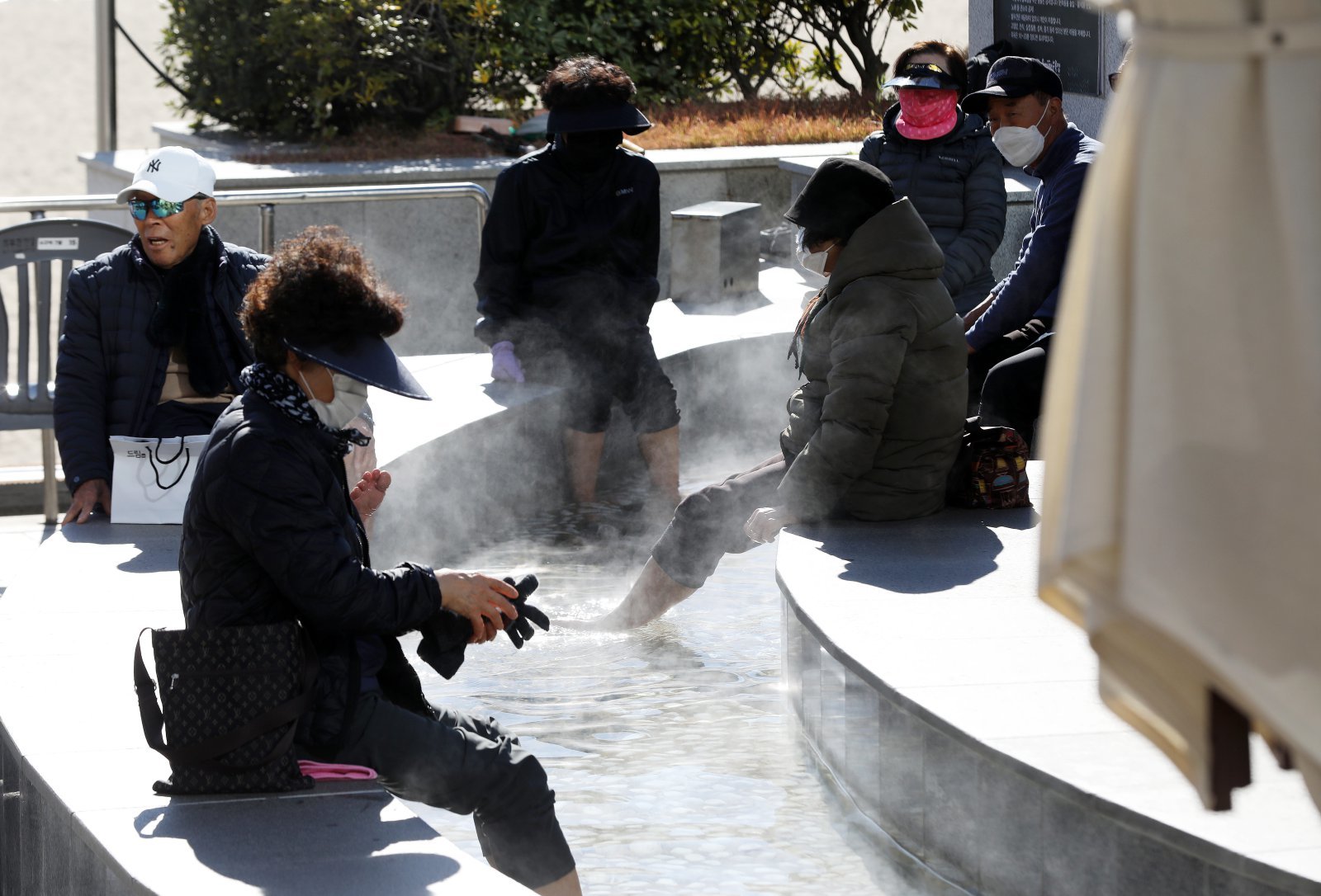 전국적으로 추위가 기승을 부린 3일 부산 해운대해수욕장 온천족욕탕을 찾은 시민들이 따뜻한 온천물에 발을 담그고 추위를 녹이고 있다. 2025.12.3/뉴스1
