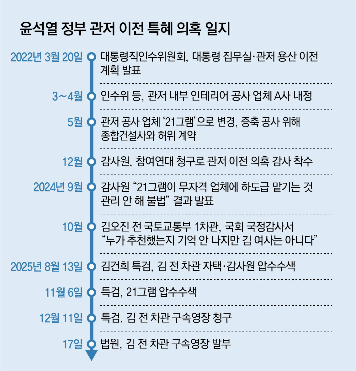 대통령 관저 이전 업무를 총괄했던 김오진 전 국토교통부 1차관이 특검에서 “대통령직 인수위원회 근무 당시 윗선의 지시를 받아 관저 인테리어 공사 업체를 도중에 변경했다”고 진술한 것으로 17일 확인됐다. 관저 공사를 맡은 건 김건희 여사와 친분이 있었던 이들이 운영하는 ‘21그램’이라는 업체였다.