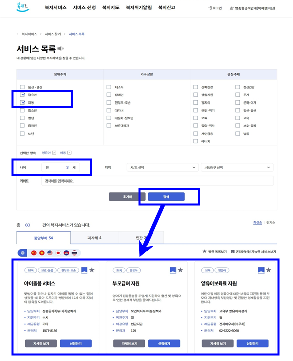 통합 복지 플랫폼 ‘복지로’의 서비스 찾기 예시 화면. 서비스 목록에서 원하는 조건을 선택하면 검색 결과를 확인할 수 있다. 신청을 원하는 경우 신청하기 버튼을 눌러 서비스 신청 단계로 들어갈 수 있다. 한국사회보장정보원 제공