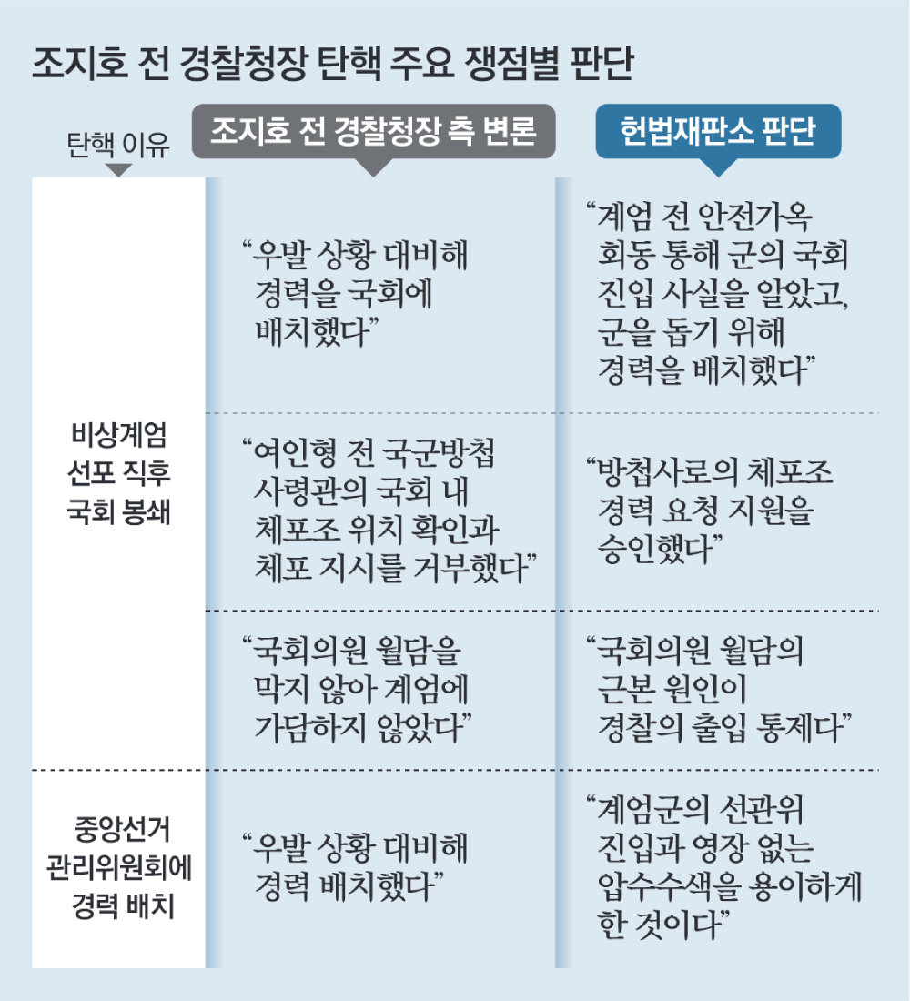 헌재는 조 전 청장이 경찰청장으로서 윤석열 전 대통령 지시가 헌법과 법률에 반하는 것이었는지 판단했어야 했다고 지적했다. 특히 그와 김봉식 전 서울경찰청장이 계엄 선포 직후 경찰 300여 명을 국회 출입문 중심으로 배치하고, 포고령 발령 이후 경찰을 추가 투입해 최종적으로 1700여 명을 국회 주변에 배치하는 등 국회 출입을 전면 차단해 국회의원의 계엄 해제 요구권 행사를 적극 방해했다고 봤다. 이로써 계엄 해제 의결을 위한 국회 본회의가 지연됐다는 것이다.