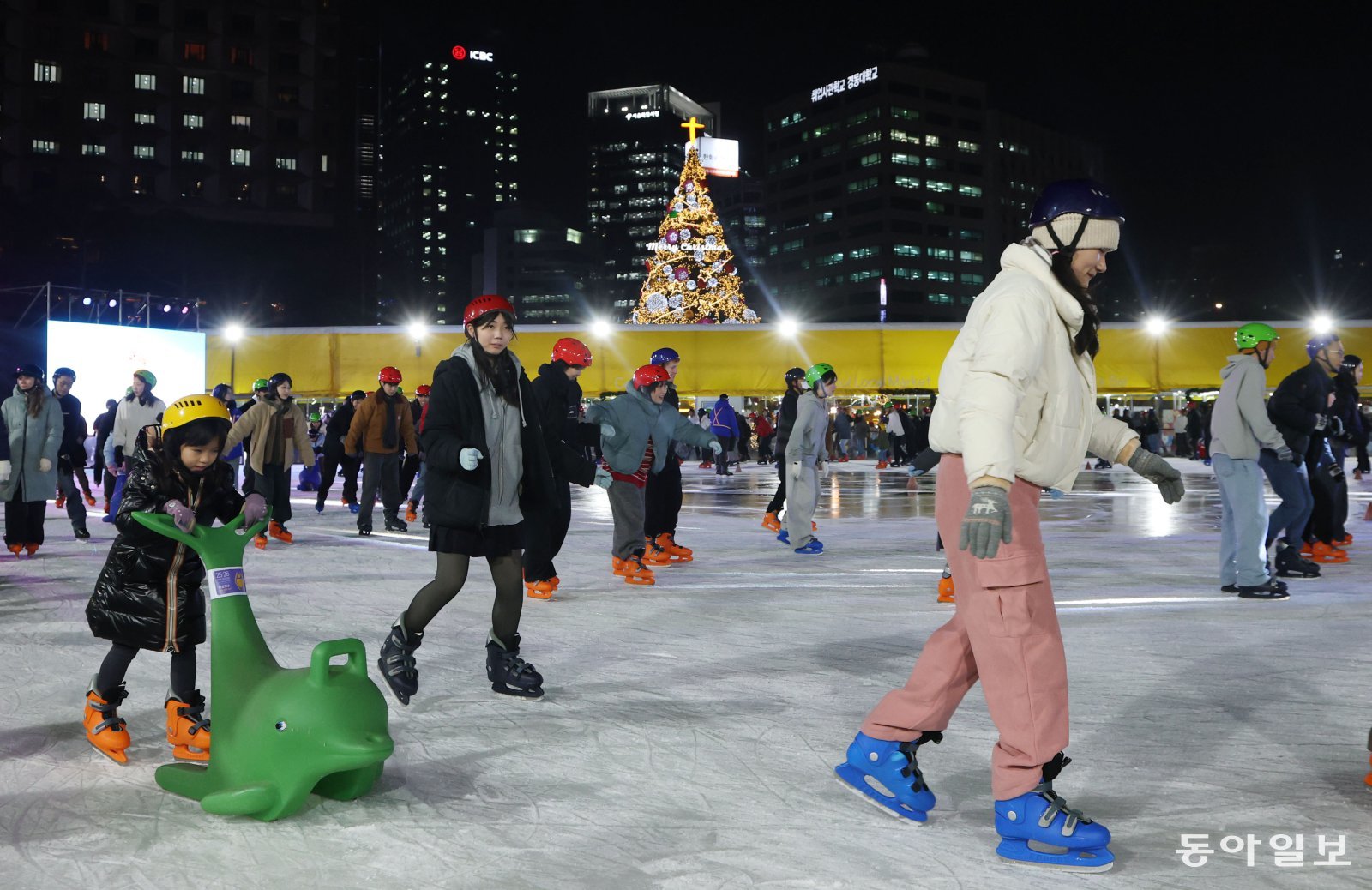 19일 오후 서울 중구 서울광장 스케이트장에서 시민들이 스케이트를 타고 있다. 스케이트장은 내년 2월 8일까지 운영되며, 1시간 이용료는 1000원으로 헬멧과 스케이트 대여료가 포함된 가격이다. 기상 상황에 따라 운영이 중단될 수도 있다.