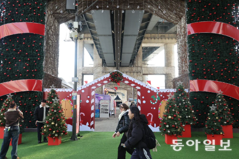 포토존도 이번 행사의 주요 볼거리다. 청담대교 교각 아래 설치된 루미나리에와 쿠키하우스를 배경으로 한 ‘로맨틱 포레스트’를 비롯해 자벌레 실내에는 크리스마스 파노라마, 로맨틱 라운지 등 테마형 포토존이 조성됐다. 크리스마스 트리 앞에서는 가족 단위 방문객들이 아이의 손을 잡고 사진을 찍는 모습도 눈에 띄었다. 두꺼운 외투와 목도리로 무장한 시민들은 한강 바람에 몸을 움츠리면서도 조명 아래에서는 발걸음을 멈추고 연말 분위기를 즐겼다.