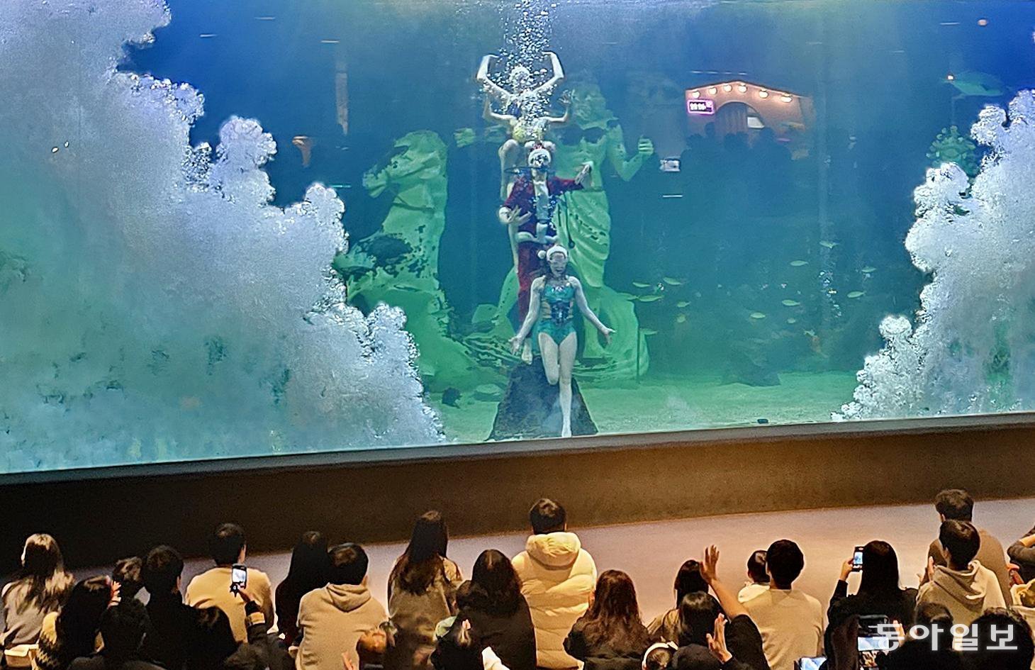 22일 대전 유성구 한 백화점에 있는 수족관에서 성탄절과 연말을 맞아 산타 복장을 입은 잠수사가 수중 공연을 하고 있다.