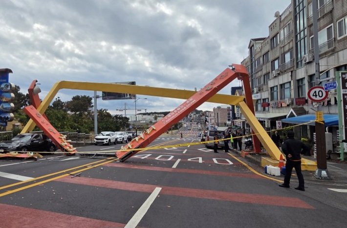 23일 제주도 소방안전본부에 따르면 이날 오후 1시 39분경 서귀포칠십리특화거리에서 5톤 윙바디 트럭의 적재함 덮개가 도로를 가로질러 설치된 대형 아치형 조형물에 부딪히는 사고가 발생했다. 윙바디 트럭은 적재함 문이 날개처럼 측면으로 열리는 구조다.
