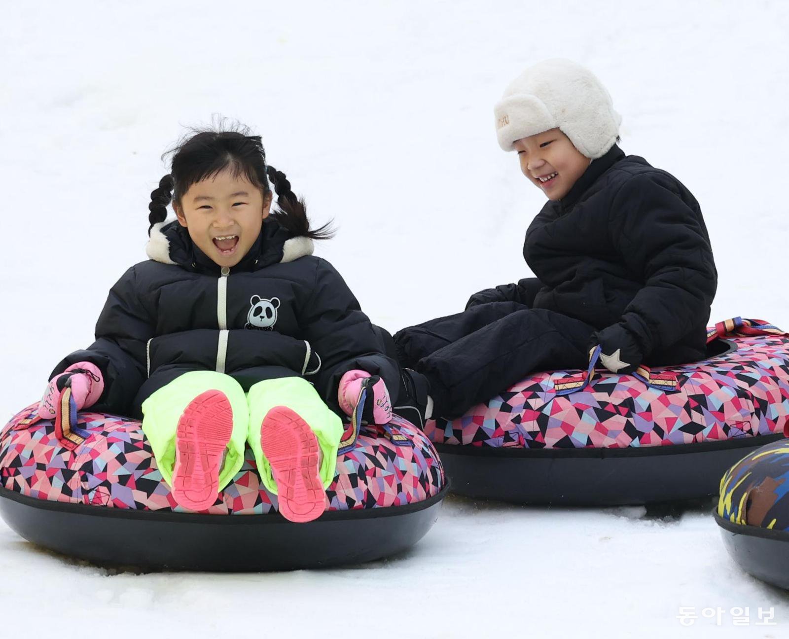 23일 서울 노원구 서울과학기술대 종합운동장 ‘씽씽 눈썰매장’에서 어린이들이 튜브 모양 눈썰매를 타며 놀고 있다. 이날 개장한 썰매장에는 50m, 90m 높이 슬로프에 자동 출발대 장치를 갖추고 있으며 아이스링크와 눈놀이 동산, 빙어잡이도 체험할 수 있다. 내년 1월 25일까지 매일 오전 10시부터 오후 5시까지 운영된다. 주말과 휴일에도 정상 운영하지만 1월 9일과 15일은 대학 입시 관련 일정에 따라 휴장한다.
