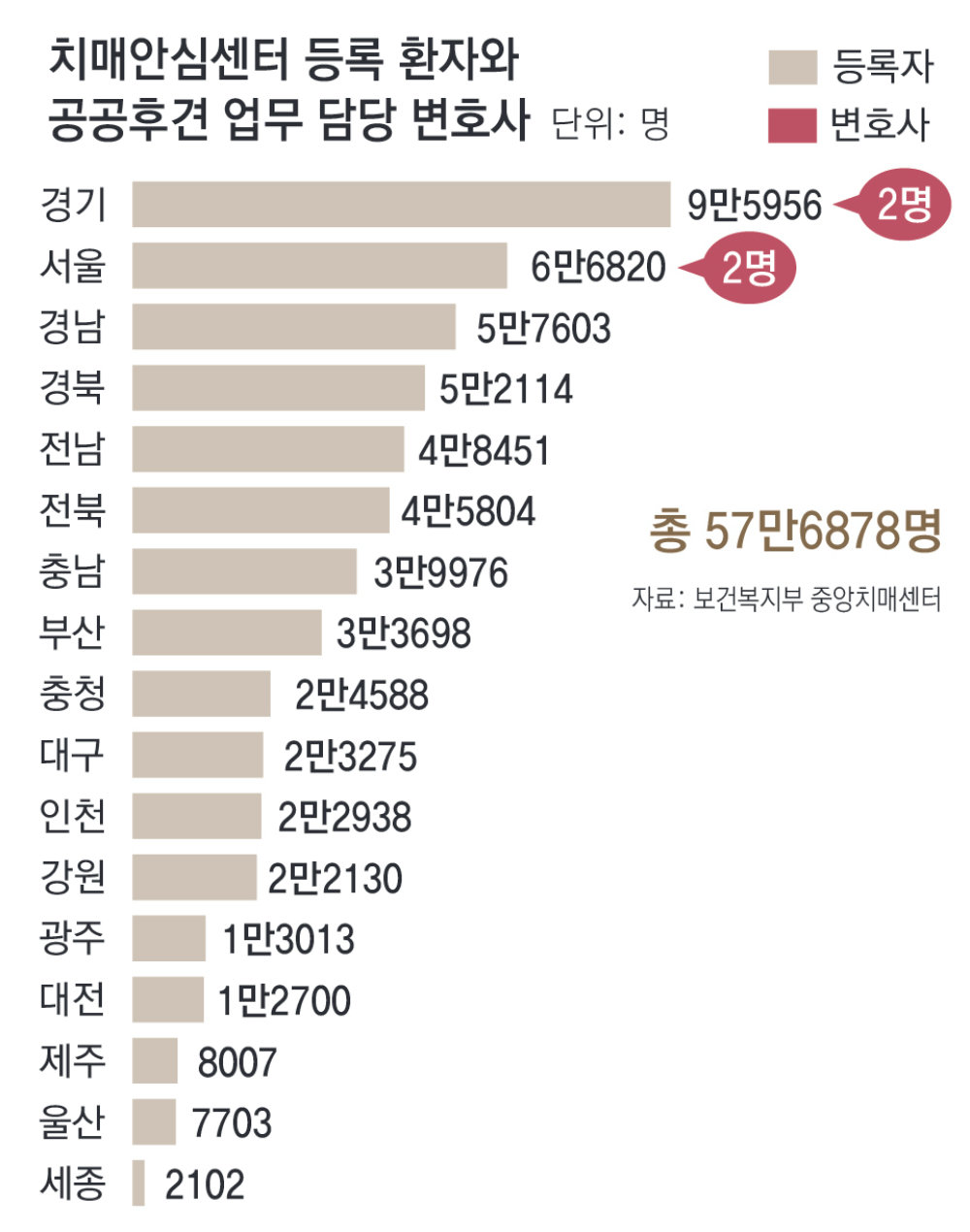 치매관리법 시행 규칙에 따라 센터는 사회복지사 1급, 간호사, 작업치료사, 임상심리사를 각각 1명 이상 둬야 하지만, 열악한 채용 여건 탓에 공석이 수두룩하다. 특히 치매 노인의 삶 전반을 케어하는 사회복지사 비중은 전체 직원의 14.4%(718명)에 불과하다. 의료 지원에만 치우친 인력 구조 탓에 법률 및 후견 지원을 담당할 전문성은 갈수록 고갈되고 있다.