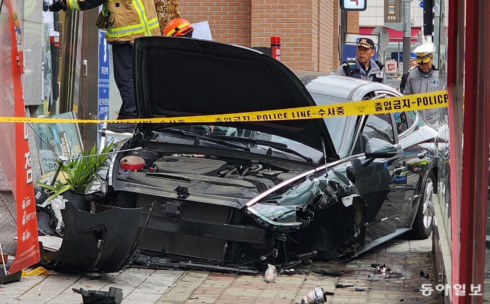 23일 오전 경기 용인시 수지구 신분당선 성복역 인근에서 승용차가 상가 건물로 돌진해 유리창 등이 파손돼 있다. 이 사고로 상가 내부에 있던 30대 여성 1명이 경상을 입고 병원으로 이송됐다. 운전자인 80대 남성은 경찰 조사에서 “기억이 나지 않는다”는 취지로 진술했다.