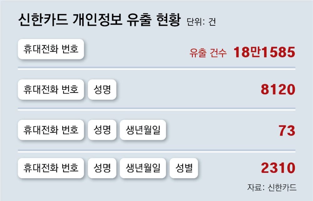 23일 신한카드는 가맹점 대표의 휴대전화 번호 18만1585건과 휴대전화 번호와 성명이 포함된 개인정보 8120건 등 총 19만2088건이 유출된 정황을 발견하고 개인정보보호위원회에 신고했다고 밝혔다. 다만 신한카드 자체 조사 결과 주민등록번호, 카드번호, 계좌번호 등 민감한 정보나 다른 일반 고객 정보는 유출되지 않은 것으로 파악됐다.