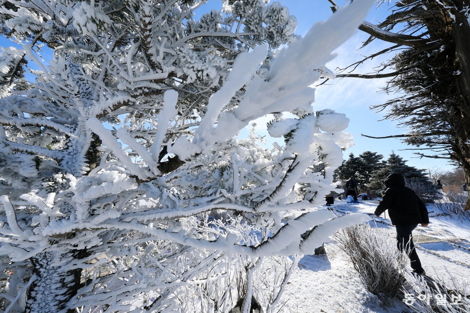크리스마스이브인 24일 오전 강원 평창군 발왕산 정상에서 관광객들이 활짝 핀 상고대 사이를 거닐고 있다. 성탄절인 25일은 북서쪽에서 찬 공기가 내려와 아침 최저기온이 영하 8도∼영상 3도 수준으로 떨어질 전망이다. 26일에는 기온이 더욱 떨어져 아침 최저기온이 영하 17도∼영하 3도의 강추위가 예보됐다.