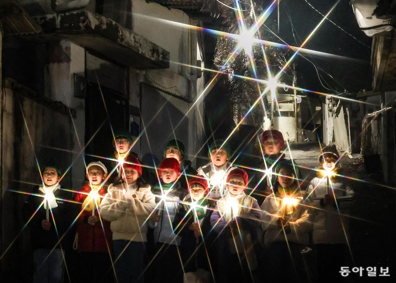 크리스마스이브인 24일 서울광염교회 어린이합창단이 서울에서 몇 안 되는 달동네인 노원구 상계3동 양지마을에서 캐럴을 부르며 아기 예수의 탄생을 축하하고 있다. 이 교회는 1992년 설립 이후 매해 성탄절 헌금 전액을 어려운 이웃을 돕는 데 사용하고 있다.