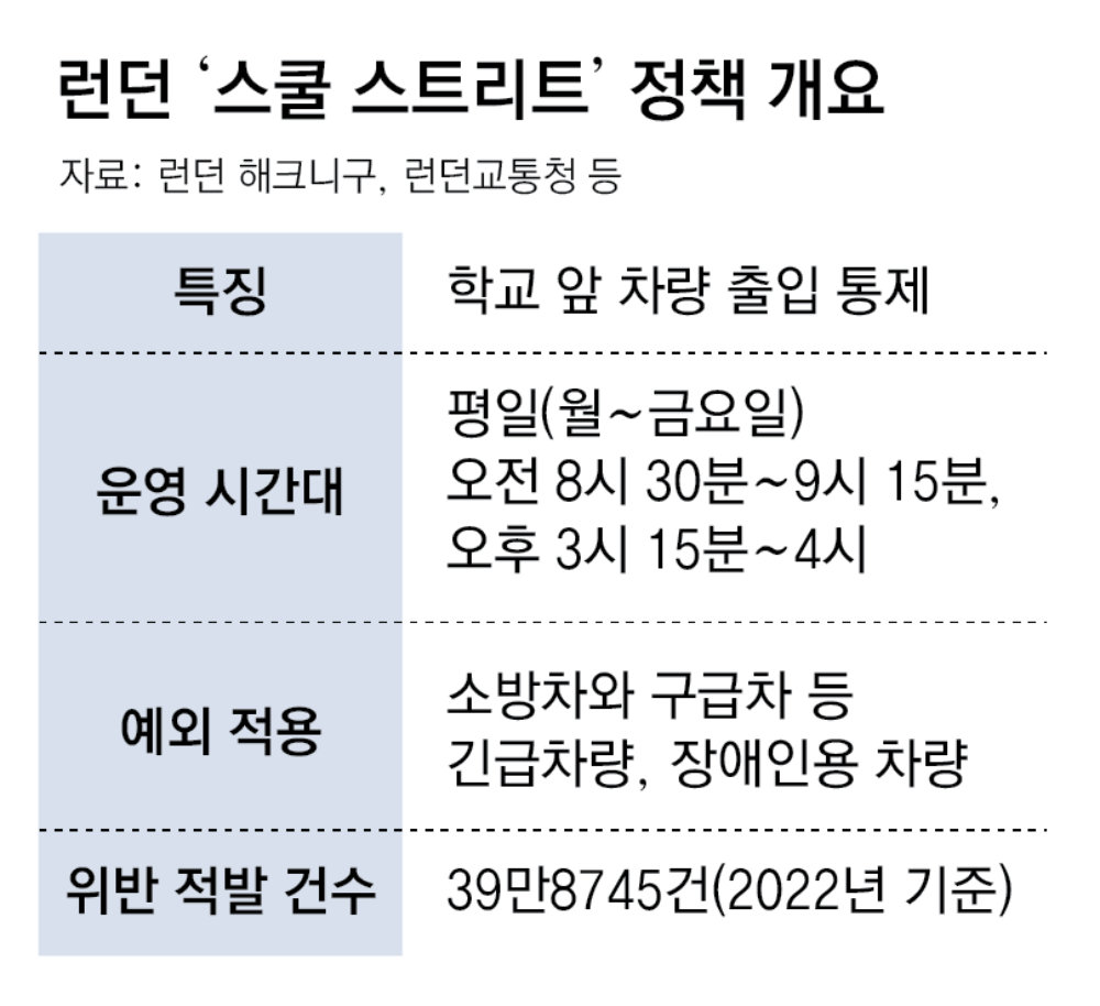 영국의 보험사 ‘처칠 모터 인슈런스’에 따르면 2022년 스쿨 스트리트 위반으로 적발된 건수는 총 39만8745건으로 집계됐다. 캠던구 등 6개 구에서는 각각 3만 건 이상이 적발됐지만, 같은 기간 해크니구는 5818건에 불과했다. 이는 초기에 정책을 도입한 만큼 주민들의 인식이 높아졌기 때문으로 풀이된다. 위반 시 부과되는 과태료는 130파운드(약 26만 원)지만, 조기 납부 시 절반인 65파운드(약 13만 원)로 줄어든다.