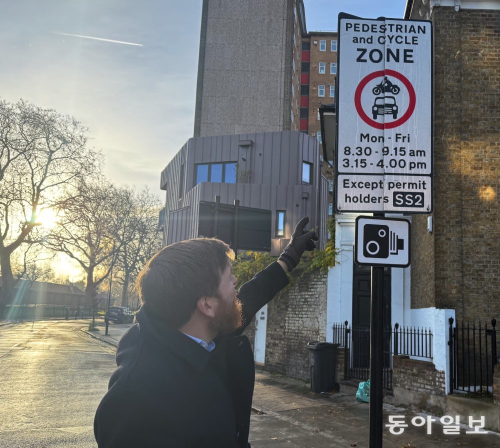 타일러 린턴 해크니구 교통국장이 차량 통행 제한 표지판을 가리키고 있다. 런던=오승준 기자 ohmygod@donga.com