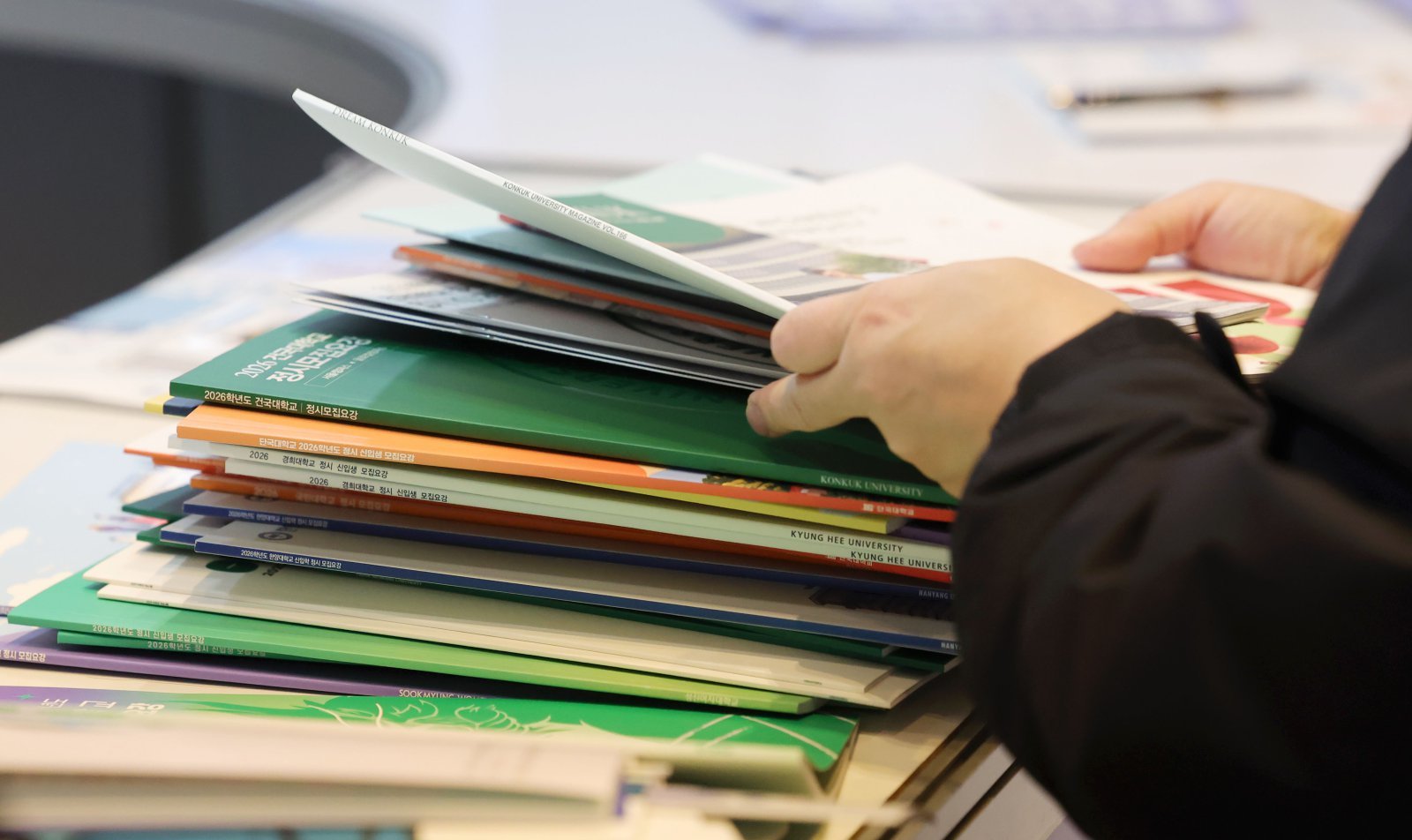 18일 서울 강남구 코엑스에서 열린 2026학년도 정시 대학입학정보박람회를 찾은 한 학부모가 각 대학별 정시모집요강 책자를 정리하고 있다. 2025.12.18. 서울=뉴시스