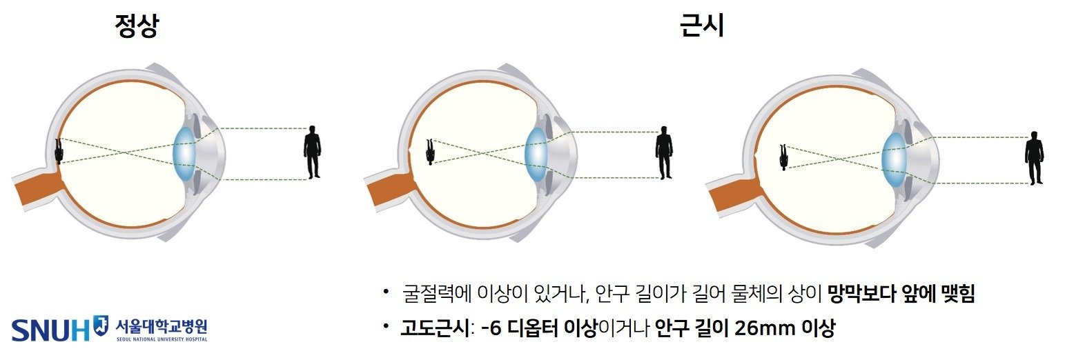 근시는 눈으로 들어온 빛이 망막보다 앞에 맺혀 멀리 있는 물체를 선명하게 보지 못하는 상태다. 사진은 고도 근시의 정의.(서울대병원 제공)