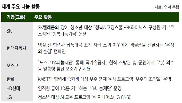 재계 관계자는 “불확실한 경영 환경 속에서도 주요 그룹들이 단순 기부를 넘어 기술·상생·미래세대 육성 등 각자의 강점을 살린 사회공헌 활동을 지속하고 있다”며 “일회성 지원이 아닌 지속가능한 프로그램을 통해 사회적 가치를 창출하고 ESG 경영과 연계한 체계적인 나눔 문화를 정착시켜 나가는 모습”이라고 말했다.