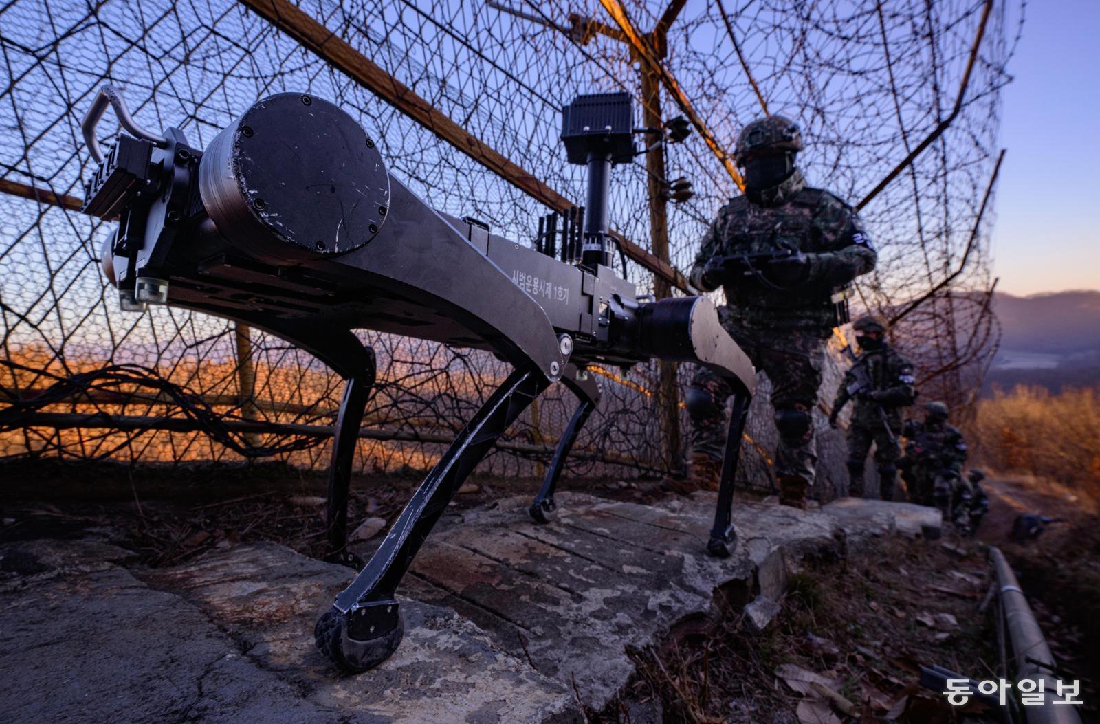 5사단 열쇠부대 장병들이 경기 연천군 접경 지역에서 다족 보행 로봇과 함께 철책 점검을 하고 있다. 육군은 지상로봇운용팀을 통해 장병들이 접근하기 어려운 지역에서 경계 작전을 펼칠 수 있도록 다족 보행 로봇을 시범 운용하고 있다.