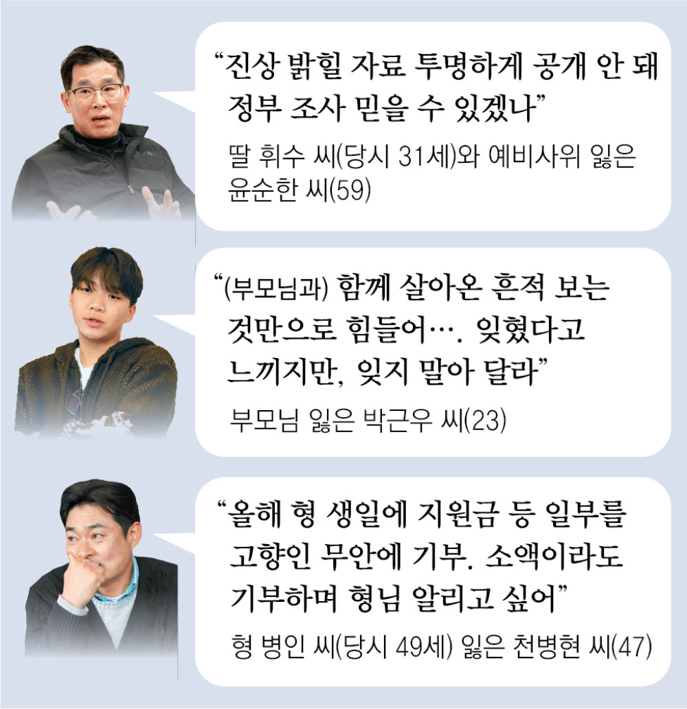 사고로 부모를 잃은 박근우 씨(23)는 “유족들이 원하는 건 진상 규명과 책임자 처벌 두 가지인데 그 길이 이렇게 멀고 험한 줄 몰랐다”며 “독립된 조사 기구에서 다양한 가능성을 열어놓고 조사할 수 있길 바란다”고 했다.