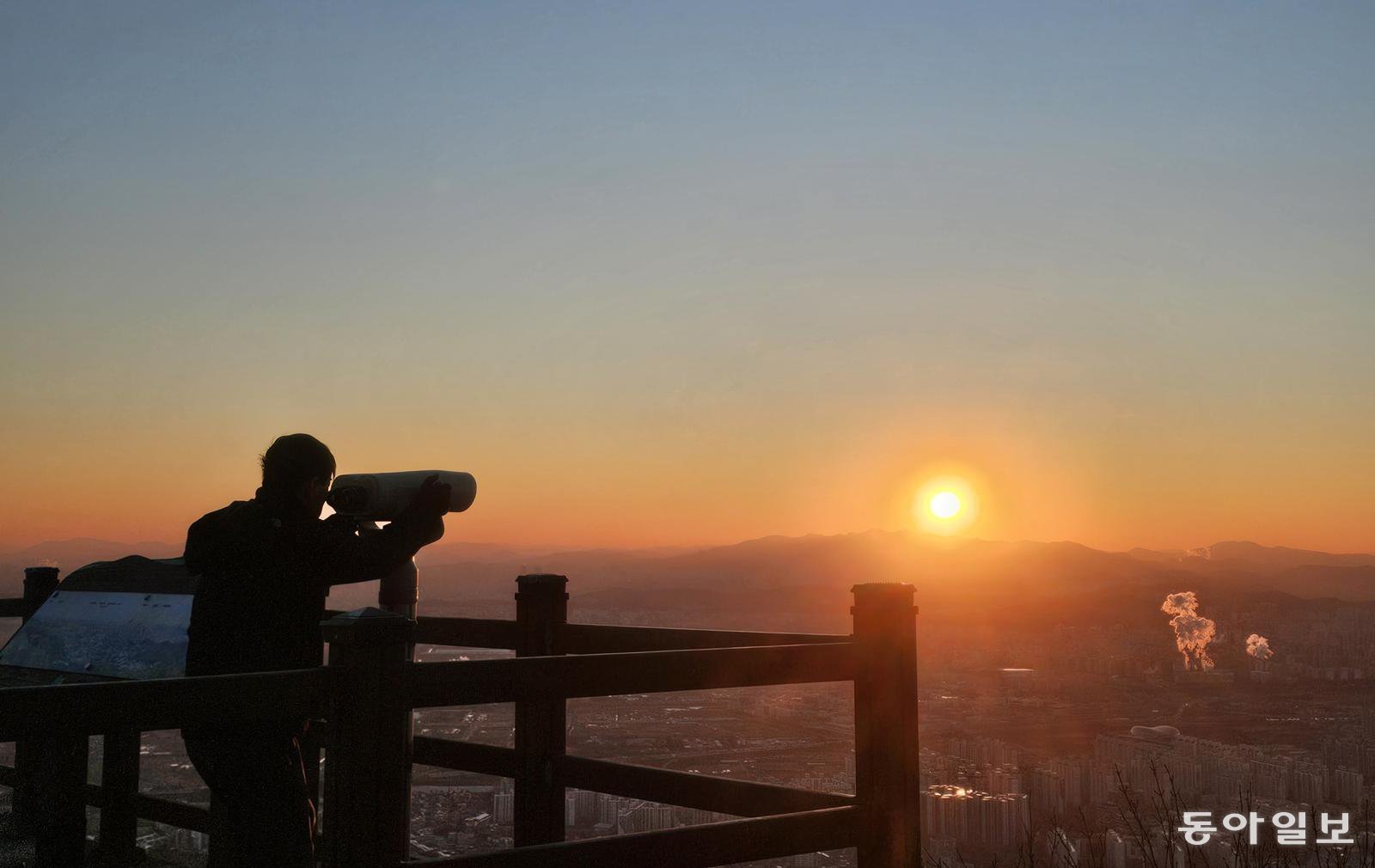 26일 인천 계양구 계양산 정상을 찾은 시민들이 멀리 관악산 위로 떠오르는 해를 감상하고 있다. 계양산은 영종도 거잠포, 백운산, 월미도, 소래습지생태공원, 센트럴파크, 아라뱃길 등과 함께 인천의 해맞이 명소로 유명하다. 한편 내년 1월 1일 인천의 일출 시각은 오전 7시 48분이다.