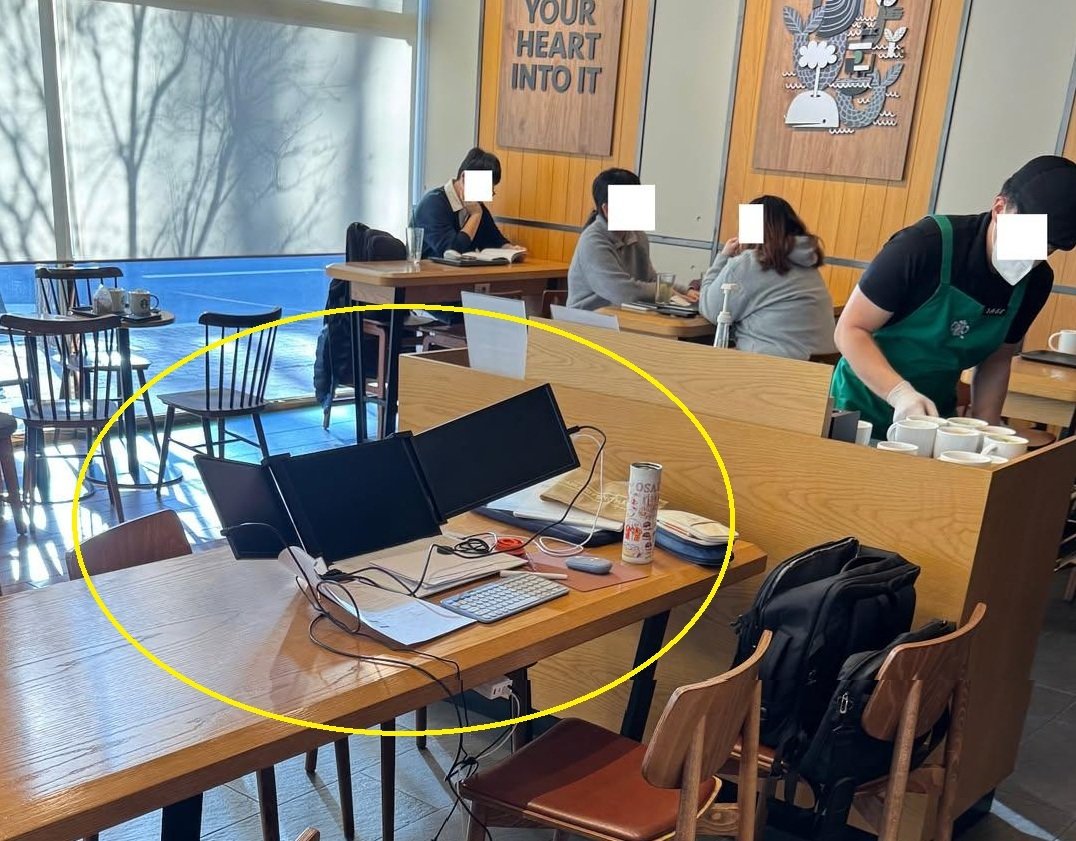 해당 남성은 스타벅스의 한 매장에서 노트북과 보조 모니터 2대를 결합해 작업을 하고 있던 것으로 보인다. 이 과정에서 손님 4명이 앉을 수 있는 테이블을 홀로 차지한 모습이다. 자신이 사용하는 좌석 옆 의자에는 두꺼운 옷도 걸어놨다.