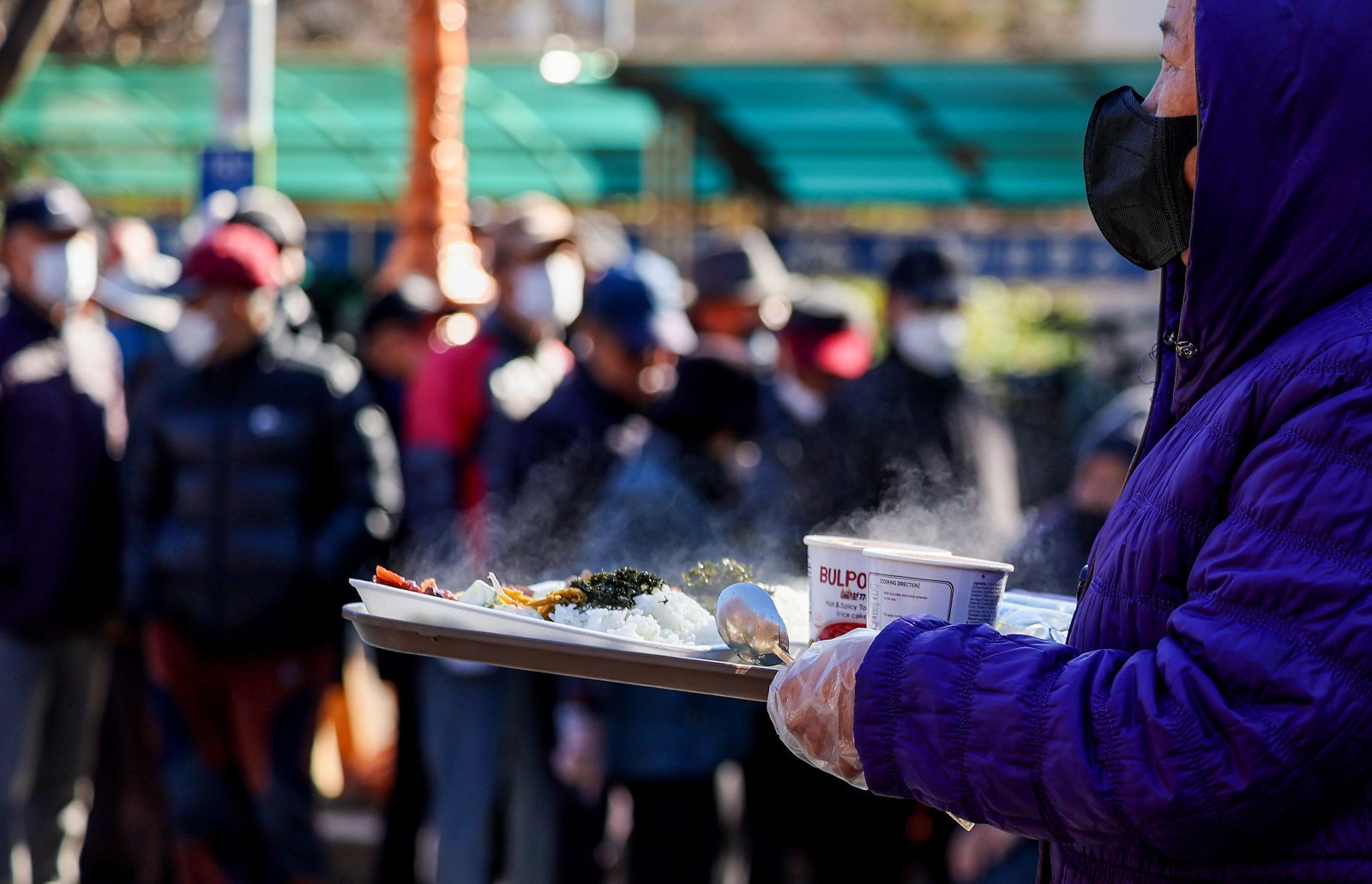 쌀쌀한 날씨를 보인 9일 대구 달서구 두류공원 사랑해밥차 무료 급식소에서 한 어르신이 배식 받은 점심을 들고 이동하고 있다. 2025.12.09. [대구=뉴시스]