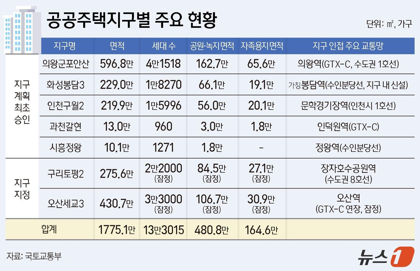 이날 국토부는 경기 구리토평2, 오산세교3 등 2곳, 706만 ㎡도 공공주택지구로 지정했다. 2023년 11월 후보지로 발표한 곳이다. 각각 2만2000채, 3만3000채 공급을 목표로 지구계획 수립을 준비할 계획이다.