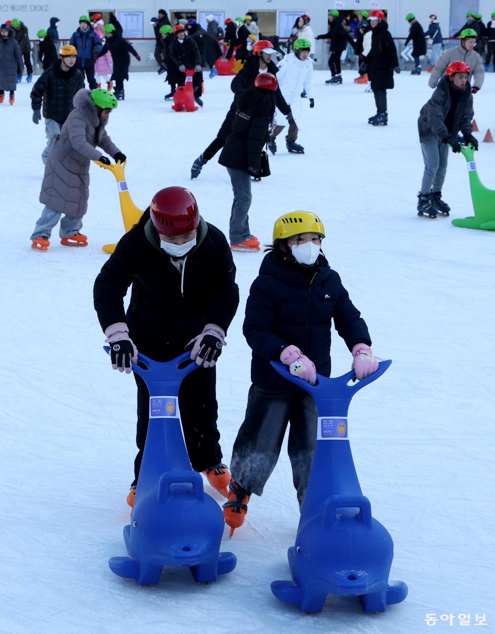 2026년의 첫날인 1일 오후 서울 중구 서울광장 스케이트장에서 방문객들이 보조기를 붙잡은 채 얼음을 지치며 즐거운 시간을 보내고 있다. 지난해 12월 19일 개장한 스케이트장은 2월 8일까지 52일간 운영된다.