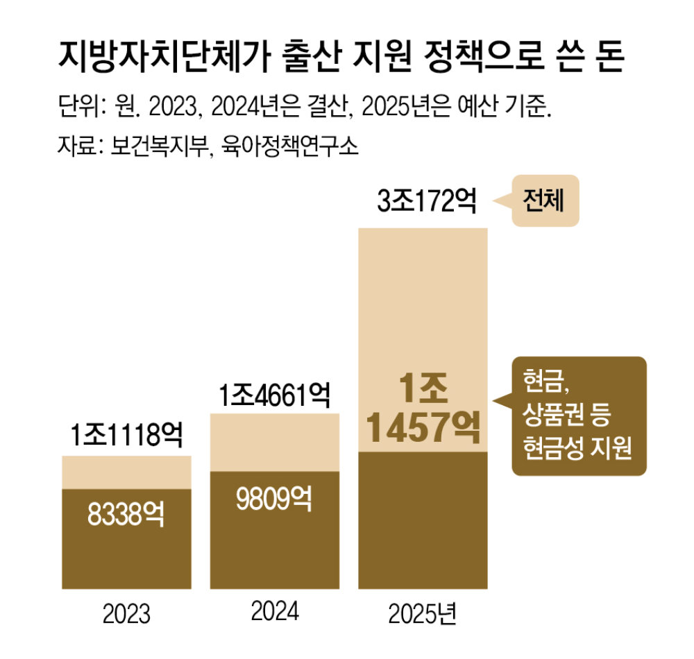 1일 보건복지부와 육아정책연구소가 발간한 ‘2025년 출산지원정책 분석’ 보고서에 따르면 지난해 지자체의 출산지원정책 예산 가운데 현금, 상품권 등 현금성 지원은 1조1457억 원으로 집계됐다. 2023년 8338억 원에서 2년 새 37.4% 급증해 1조 원을 돌파했다.