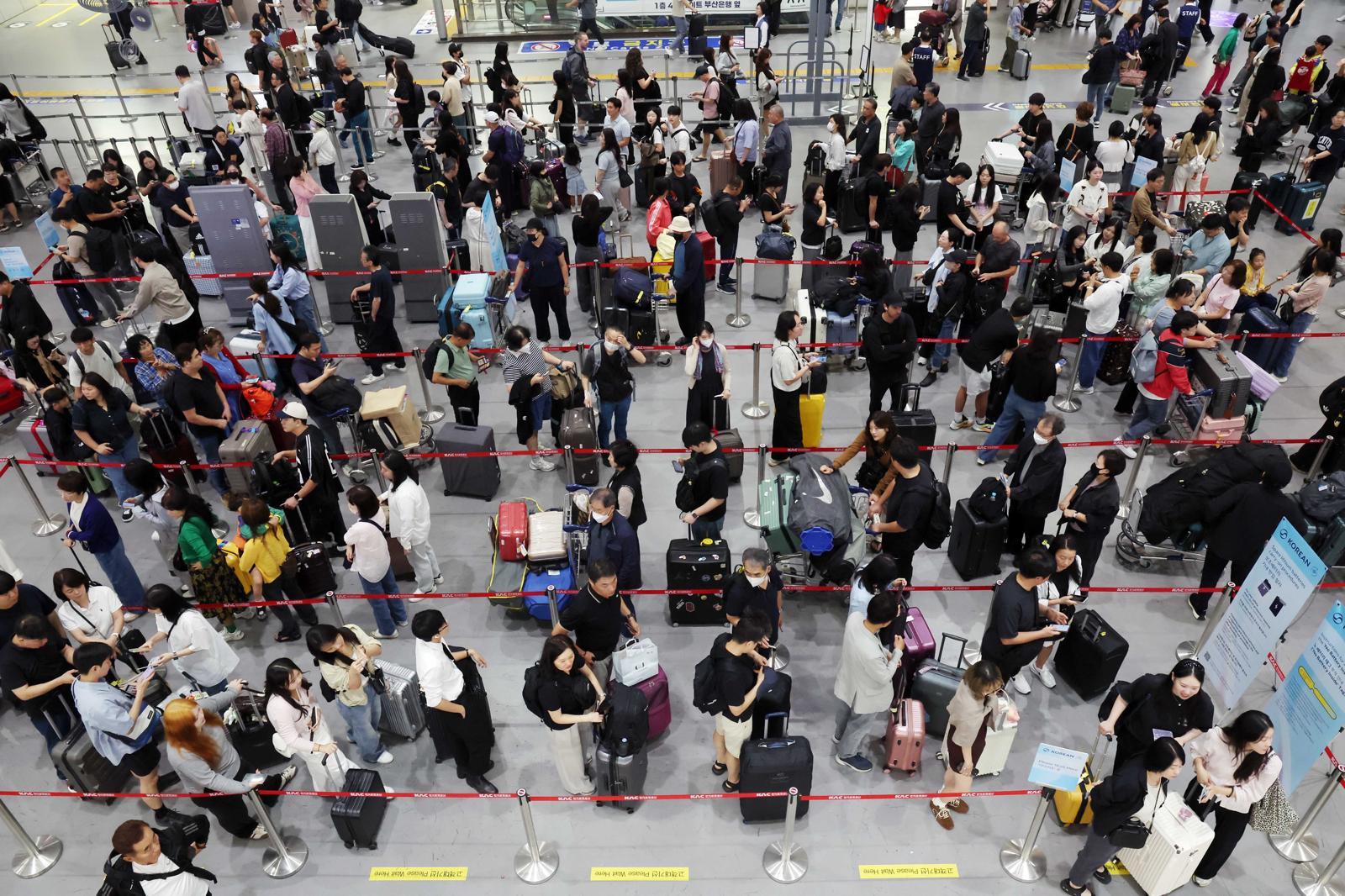 추석 연휴를 앞둔 2일 부산 강서구 김해국제공항 국제선 청사에서 해외여행을 떠나는 시민들이 출국 수속을 하고 있다. 뉴시스