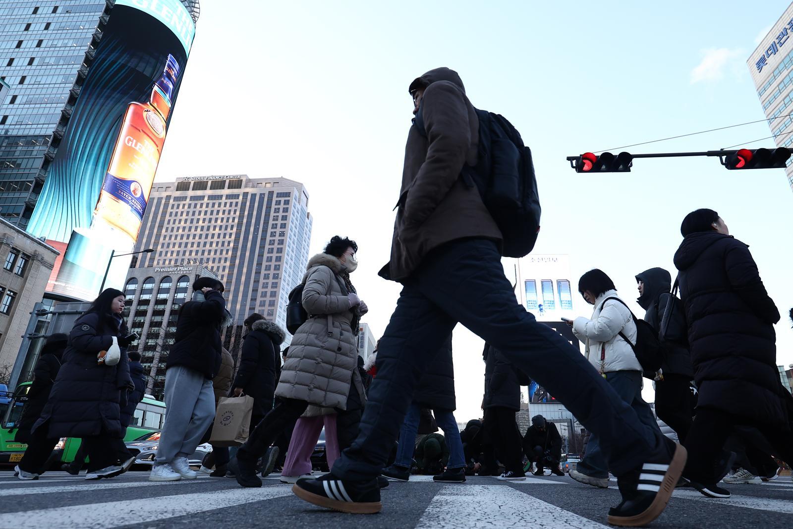 새해 첫 출근일인 2일 오전 서울 종로구 광화문 네거리에서 두꺼운 외투를 입은 시민들이 발걸음을 옮기고 있다. 2026.1.2 뉴스1