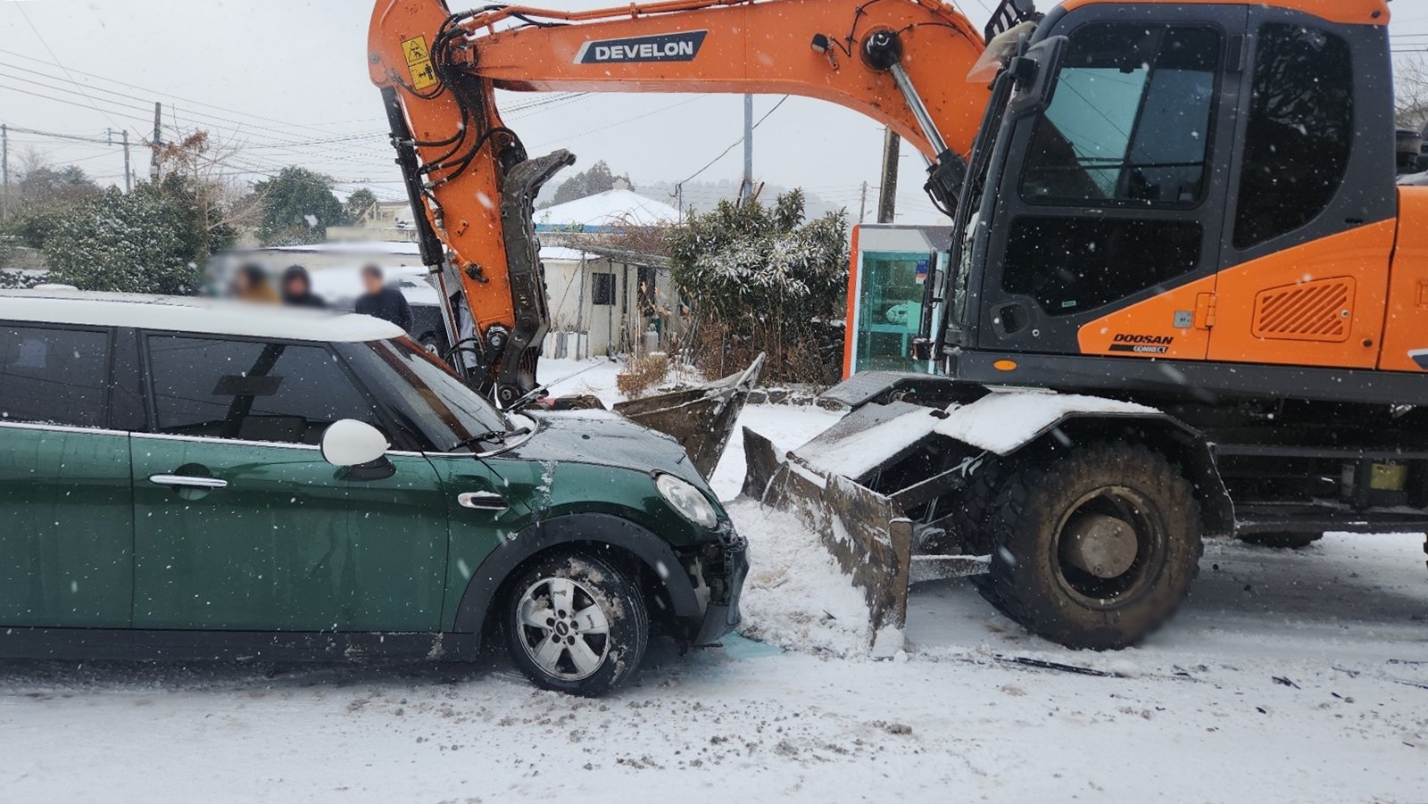 이날 오전 제주시 조천읍에서 눈길에 미끄러진 차량과 굴삭기가 충돌하는 사고가 발생했다.