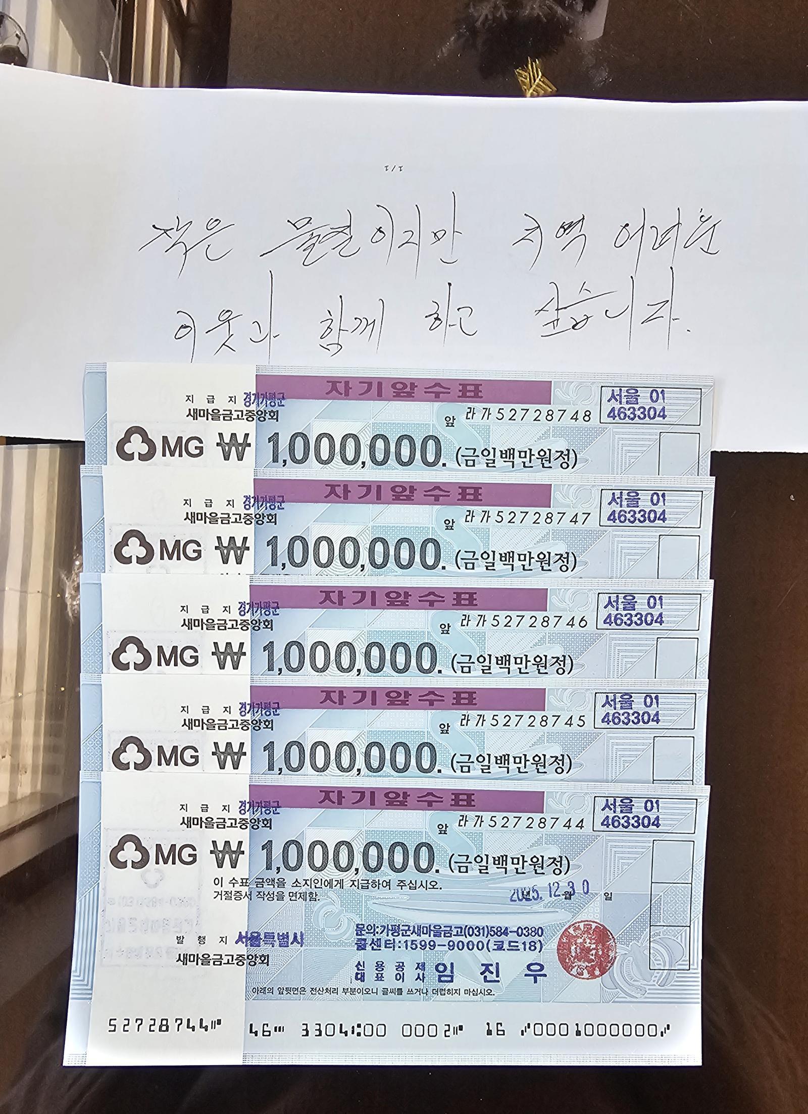 익명의 기부자가 전달한 봉투에는 “작은 물질이지만 지역의 어려운 이웃과 함께 하고 싶습니다”라는 내용과 함께 100만 원권 수표 5장이 담겨 있었다.