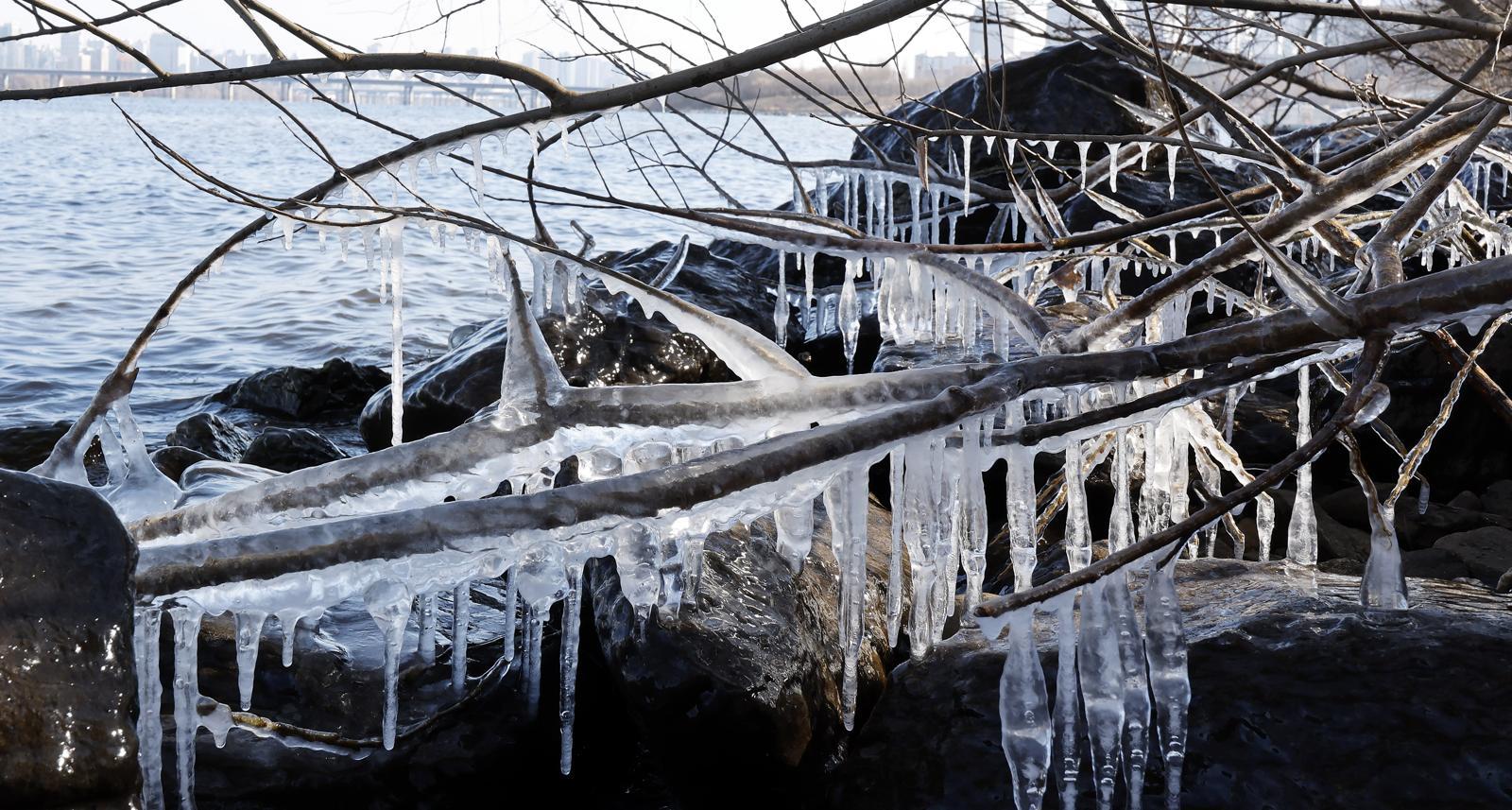 서울 최저기온이 -12도를 기록하며 한파특보가 발효된 2일 서울 영등포구 여의도 한강변에 얼음이 얼어있다. 서울=뉴시스