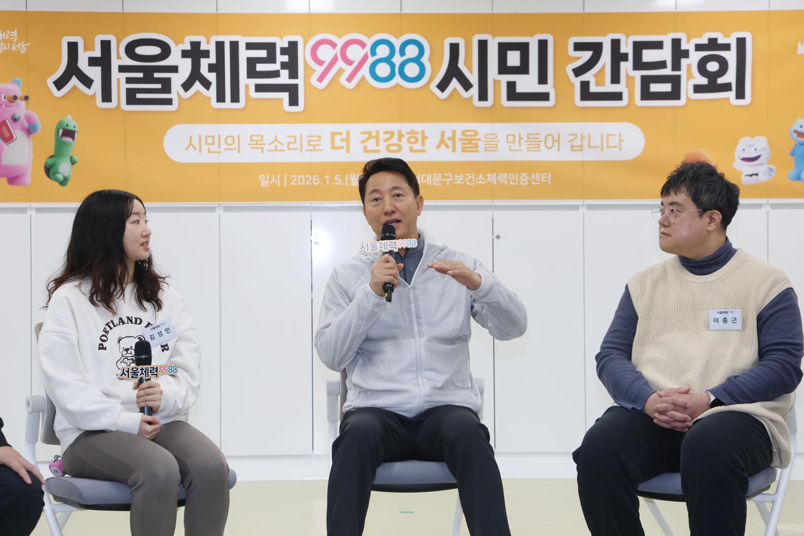 오세훈 서울시장이 5일 오전 서울 서대문구보건소 체력인증센터를 방문해 서울체력9988 시민 간담회를 하고 있다. 2026.1.5 뉴스1