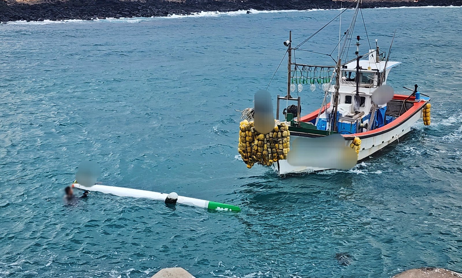 지난 3일 제주시 한경면 용수포구 인근 해상에서 전복된 카약이 옮겨지고 있다. 제주해양경찰서 제공