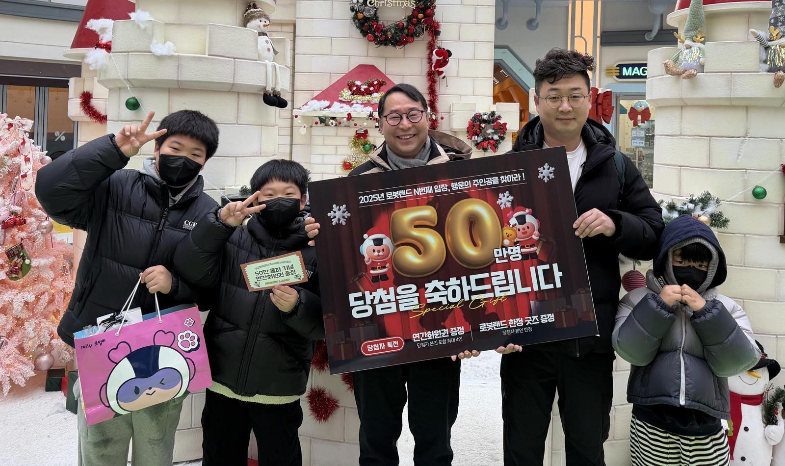 경남 창원시 마산합포구에 있는 로봇랜드 테마파크가 2019년 개장 이후 처음으로 지난해 누적 연간 입장객 50만 명을 돌파했다. 로봇랜드는 2024년 직영화 이후 신규 캐릭터 개발과 식음시설 개편 등 변화를 추진했다. 사진은 지난해 말 50만 번째 방문객에게 경품을 전달하고 기념촬영을 하는 모습.